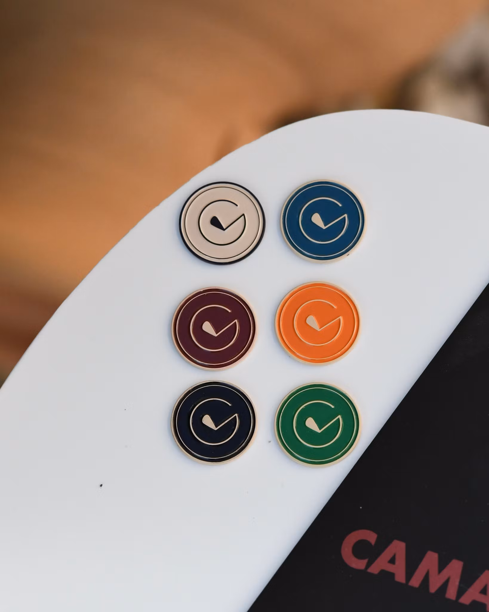 Six golf ball markers in all Golfvante colors. Original, Black Label, Red Label, Blue Label, Green Label & Orange Label.