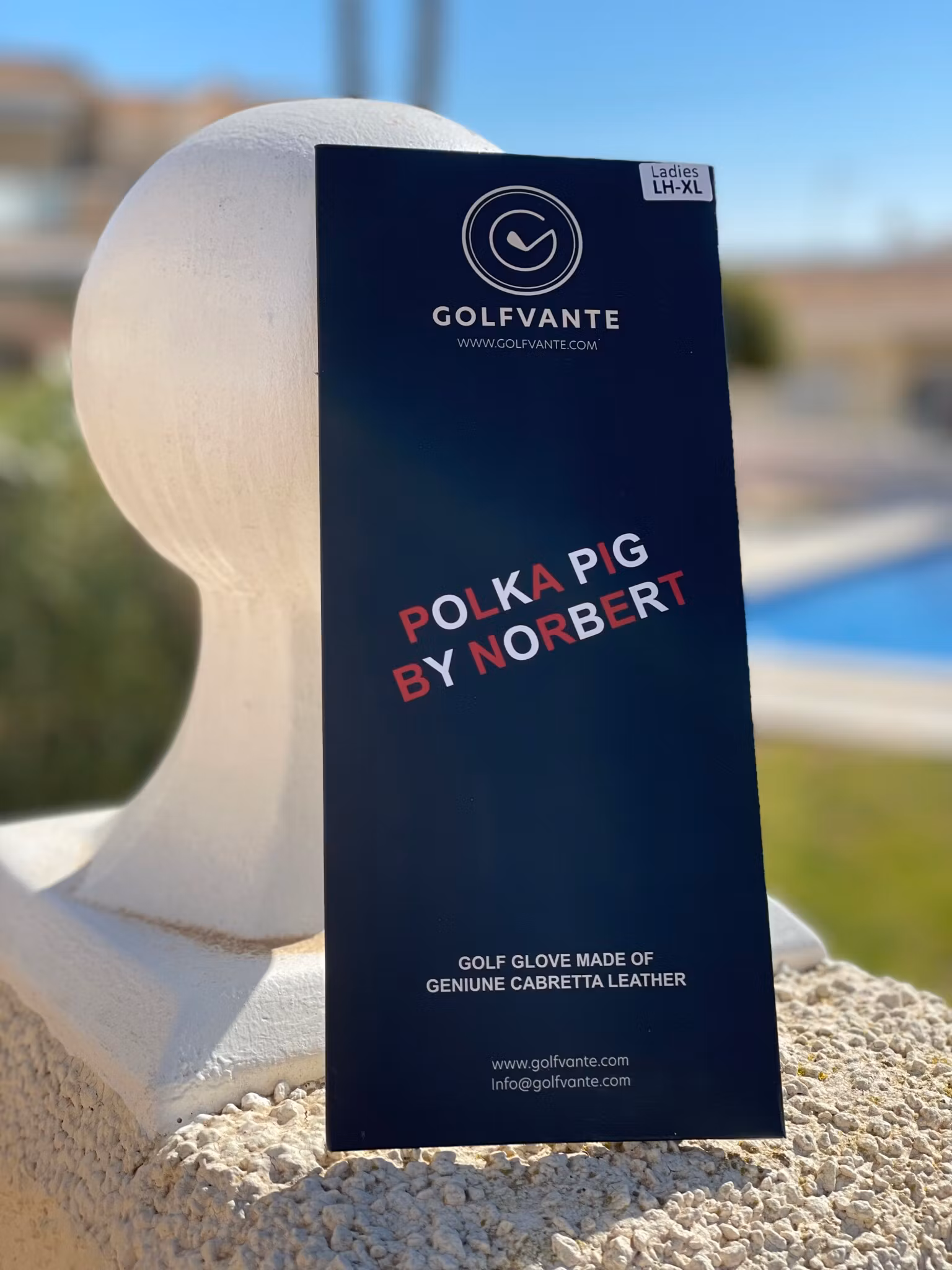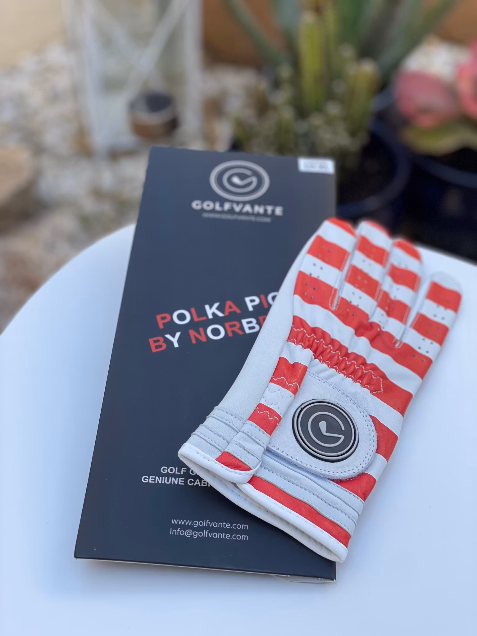 Polka Pig by Norbert är en del av Golfvantes By You Collection – handskar skapade tillsammans med kunder som vill ha ett personligt uttryck utan att tumma på spelkänsla. Modellen är gjord i cabretta-skinn i AA-kvalitet och har ett unikt uttryck med röda streck tryckta ovanpå skinnet.
